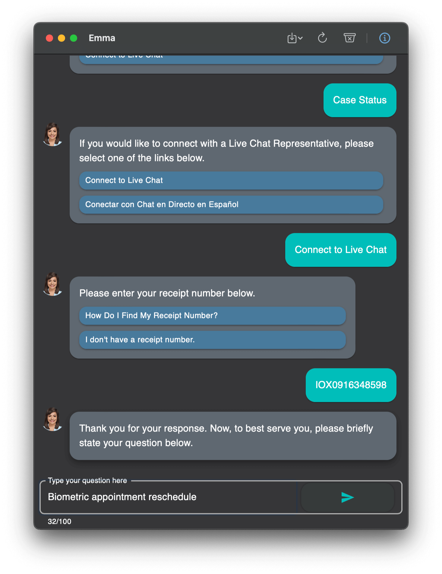 Chat with USCIS through Emma in one click and save your transcripts.