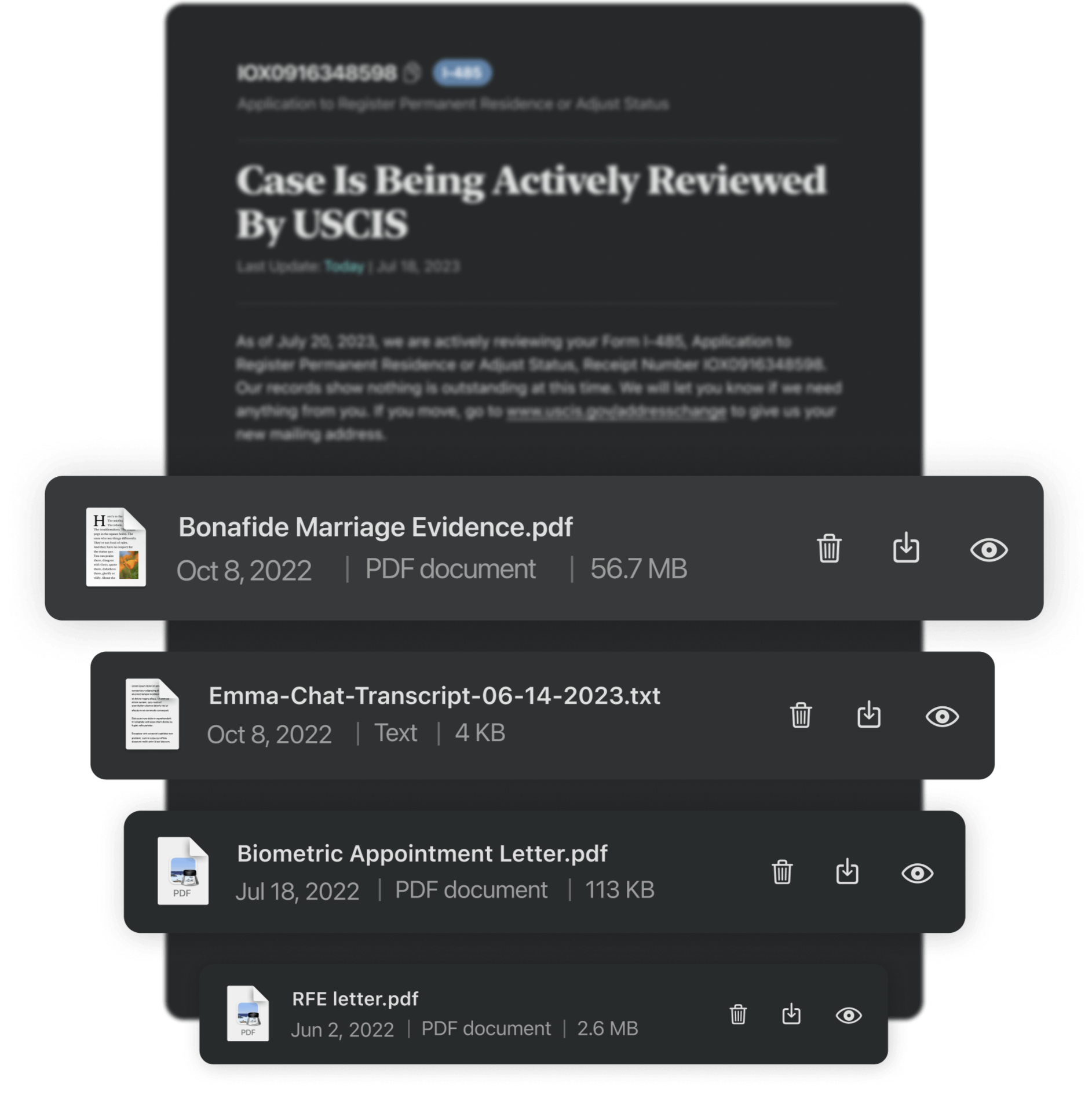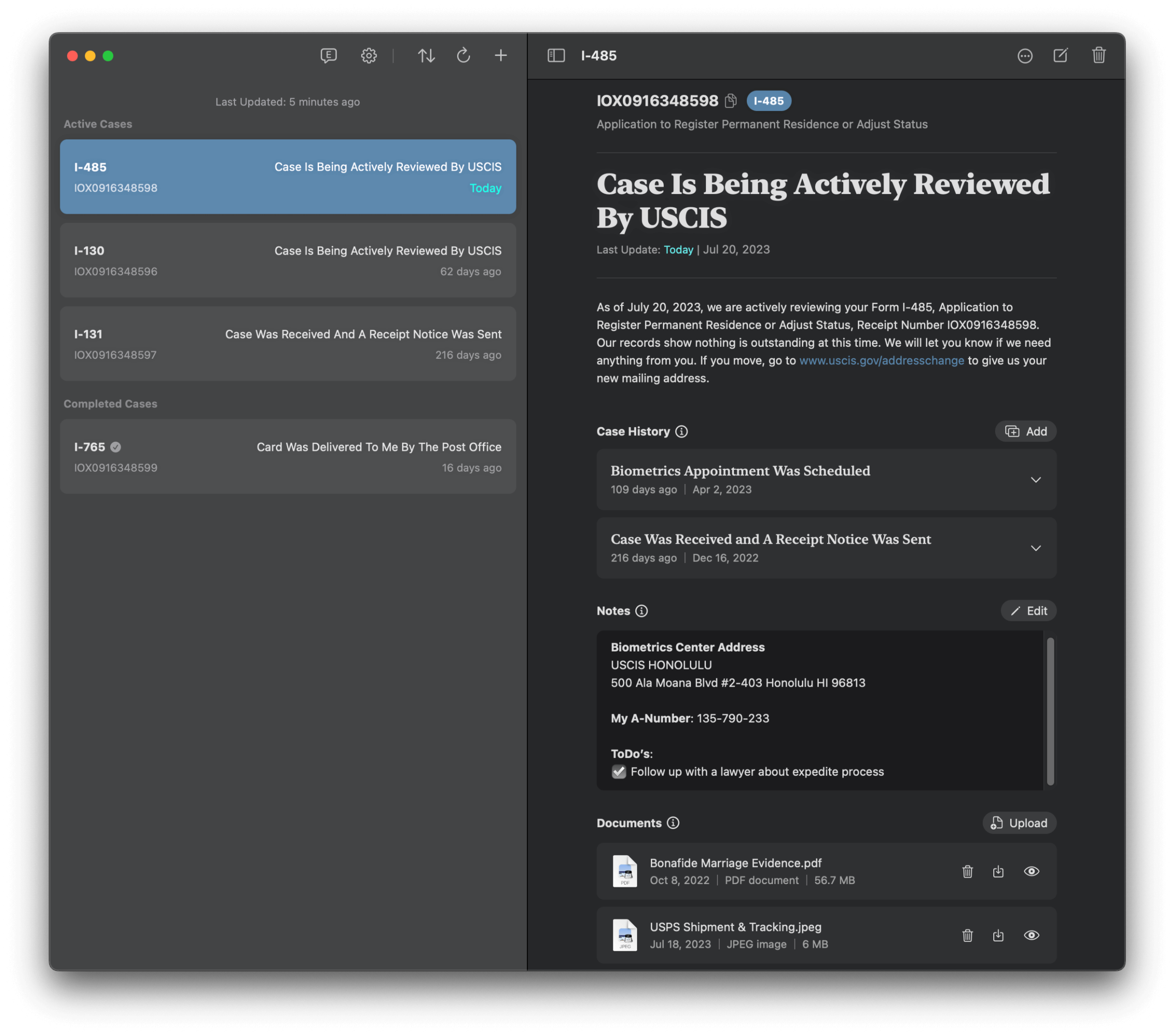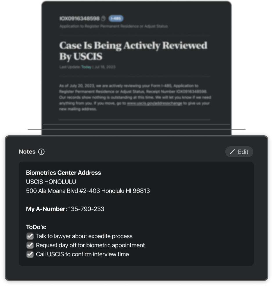 Keep track of important documents like USCIS notices, letters, and email, and view them right in the app.