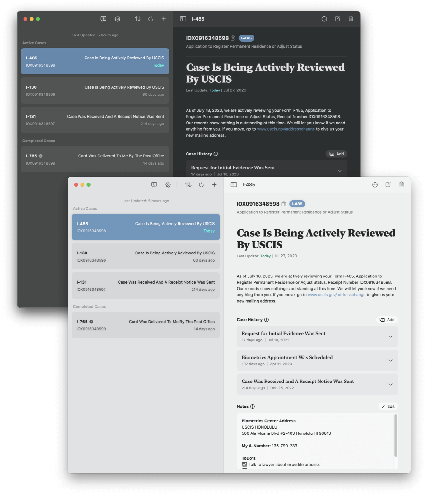 Grant iOS app comes with all the functionality of the Mac app, like case tracking, notes, attachments, Emma chat, and more. Both apps will stay in sync with iCloud. In addition, the iOS app can also send push notifications for any case changes*, so you never miss any important updates.